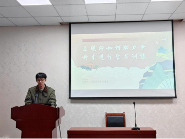 有丰富竞赛经历的2020级历史学(师范类)专业王德洲就自身如何利用互联网进行学术训练给大家做了经验分享。他提出,现代互联网高度发达,各种学术机构、学者都争先通过新媒体扩大自己的影响力,他们自学的经历或者经验在这一个互联网上是有迹可循的。他认为可以通过微信公众号,利用碎片化时间,拓宽学术视野;通过收集名师书单,来读好书读经典;利用豆瓣评分找到相关书籍。