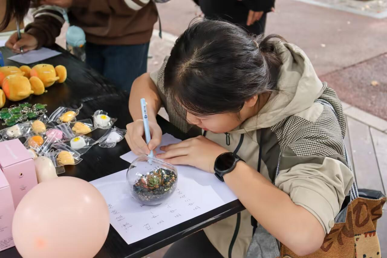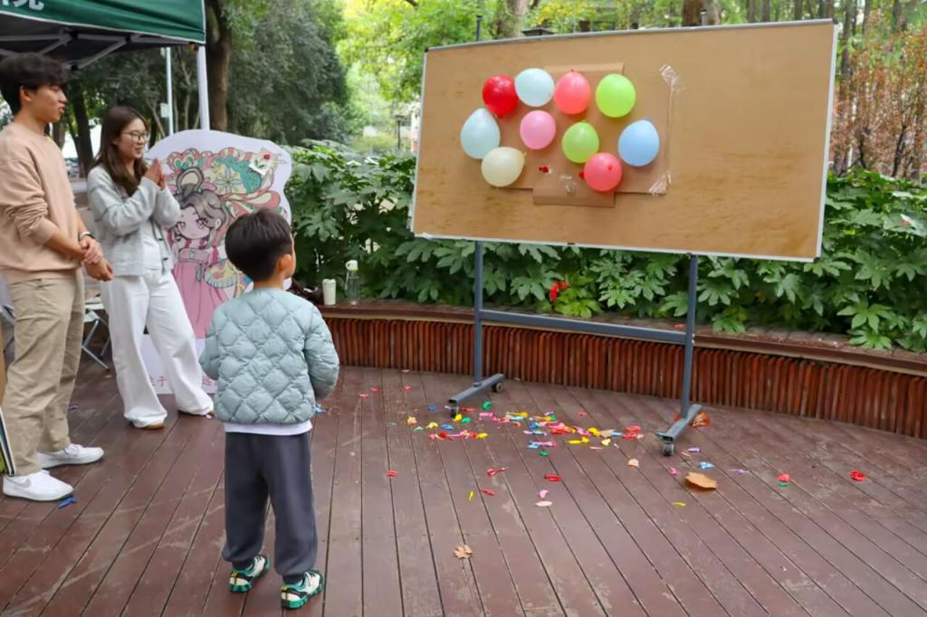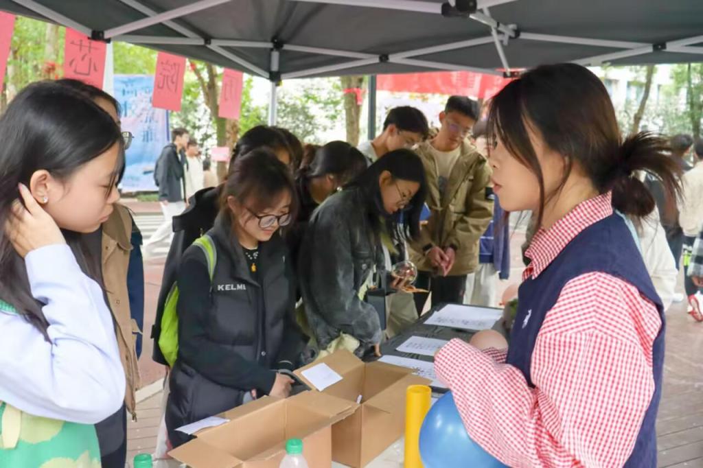 本次活动设置了四个互动模块,内容丰富、形式新颖,吸引了同学们的广泛参与。“‘镖’除烦恼”环节,参与者通过飞镖击破写有负面情绪的气球,实现压力的具象化释放;“烦恼投喂壶”以传统投壶形式,引导学生在投掷中拉近心理距离;“emoji猜词”游戏结合心理健康主题进行限时竞猜,增强了活动的趣味性与参与感;“情绪盒子”模块则采用“烦恼投递—善意回应—能量传递”的循环模式,让同学们在书写与分享中实现双向疗愈。