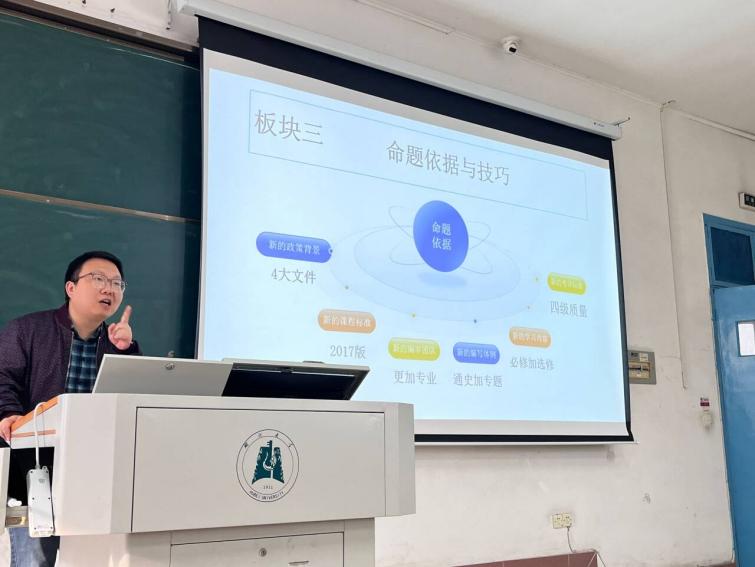 刘涛老师首先从试题的定义、试题的类型——客观题与主观题、“不同年级,不同要求”及“不同年级,不同设计”四个角度详细讲解了中学历史试题的题型与功用。之后,他师从试题的考前评价、考后评价、区分度、信度、效度、试题来源等几个方面阐释了中学历史试题的选用。最后,刘老师结合自己多年的命题经验和实践,为同学们举例说明了中学历史命题的依据与技巧,如政策背景、课程标准、编写体例、根据学情的考核内容和考评标准。