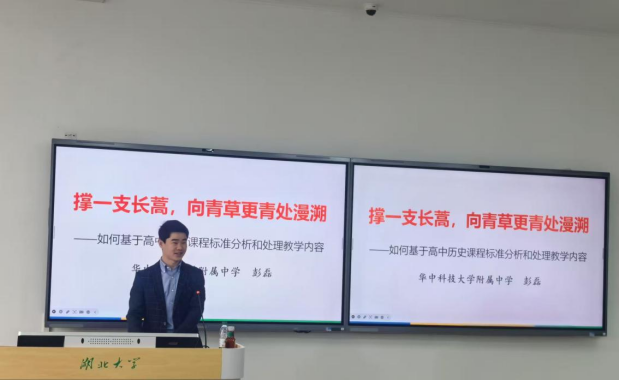 2025年3月31日上午8点,我院在4号教学楼410教室举办了一场以《撑一支长蒿,向青草更青处漫溯——如何基于高中历史课程标准分析和处理教材内容》为主题的精彩讲座。本次讲座由华中科技大学附属中学彭磊老师主讲,2023级历史学(师范类)专业本科生和2024级学科教学(历史)专业部分硕士研究生聆听了本次讲座,历史系副主任刘馗主持本次讲座。
