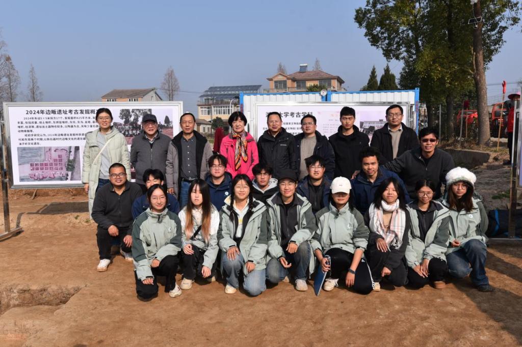 上午,李伊萍一行实地参观了边畈遗址2024-2025年出土文物及考古发掘现场,详细了解当前田野工作的进展、出土遗物情况及学生参与状况。边畈遗址发掘领队孟华平教授及带队老师介绍了边畈实习基地建设情况、学生田野实习计划及2025年遗址工作情况。李伊萍教授一行对实习基地的组织管理、安全保障及教学安排给予充分肯定,并对同学们在实习中展现出的专业热情和实践能力表示赞赏。