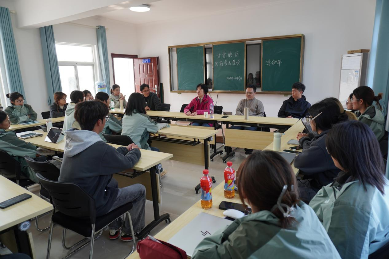 下午,李伊萍教授以“甘青地区史前考古漫谈”为题,与实习学生展开轻松而富有启发性的学术交流。她结合自身多年在甘青地区从事史前考古田野工作的经历,生动讲述了历年发掘过程中遇到的典型难题、意外发现与重要收获,并穿插分享了田野生活中的趣事与感悟。在随后的互动环节中,李教授认真倾听同学们在首次田野实习中遇到的困惑,耐心给予指导,并鼓励大家在考古实践中不断培养问题意识和独立思考能力,同时要珍惜时间,利用好此次实习的机会,不断精进自身专业知识,提升业务能力。