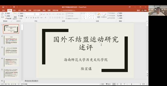 高志平教授认为,陆博士目前正在撰写《不结盟运动史》,前期围绕国外不结盟运动研究开展了大量资料搜集与整理工作,本次讲座系统梳理和评析了国外不结盟研究的概况及其发展趋势,并提出了一些具有学术价值的问题与选题,有助于对不结盟运动研究取得新的突破。华中师范大学黄正柏教授线上出席了讲座,黄教授认为,陆博士的研究对国内不结盟运动研究具有很大的启发意义。陆博士还就“美国在不结盟运动发展中的作用”“如何看待早期不结盟国家游走美苏间谋取利益”等问题做了细致回答。