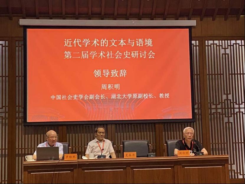 7月15-16日,我院与中国社会科学院近代史研究所学术史研究群联合主办的“近代学术的文本与语境——第二届学术社会史研讨会”在中国历史研究院成功举办。来自中国社会科学院、清华大学、北京师范大学、中国人民大学、武汉大学、华东师范大学、上海财经大学、安徽大学、湖南师范大学等高校和科研机构的近50位学者参会,中国社会科学院近代史研究所所长夏春涛研究员出席会议并致辞。我院周积明教授、何晓明教授、雷平教授、蔡智力副教授、学报编辑部马建强副编审以及博士生周荣、曾侨参加了此次会议。