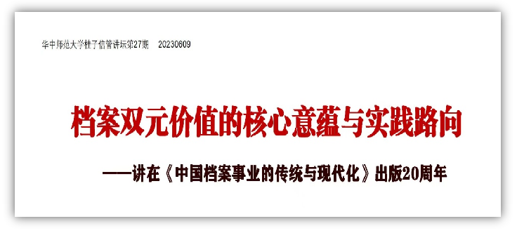 近段时间,覃兆刿教授先后应邀在吉林大学、三峡集团、山东大学、中兴通讯、武汉理工大学、长江水利委汉江集团、武汉市江岸区档案局/馆、中国科学院办公厅/档案馆、国家电网莲蓄公司、华中师范大学等全国多家企事业单位做专题讲座,借以纪念《中国档案事业的传统与现代化》一书出版20周年。这些讲座分别以《作为记忆的档案》《作为史料的档案》《企业档案资源的“固化与“活化”》《企业档案资源的建构与价值实现》《重大科技项目档案的建构与规范化目标》《中国档案事业的传统与现代化》《档案双元价值的逻辑与实证》《档案双元价值观的视野:档案资源的建构与开发》《档案双元价值与企业档案工作的“存”“用”之道》《档案双元价值的核心意蕴与实践路向》等为题,讲座受到吉林大学商学与管理学院信息管理系主任邓君教授、山东大学英国上市365副院长曲春梅教授、中科院档案馆馆长潘亚男研究馆员、中科院昆明分院副院长张教林研究员、华中师范大学信息管理学院院长李玉海教授、国家电网莲蓄公司李彬总经理以及相关档案行政部门、科研院所、高校和企业参会领导和同行专家的好评。