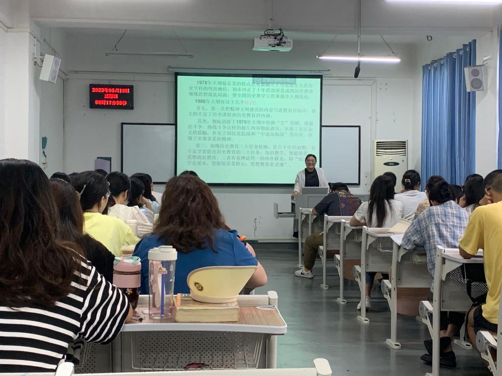 2023年5月18日上午,武汉市四美塘中学高级教师许会丽在1号教学楼221教室,做了一场题为“中学历史教学评价的变化与启示—以教学大纲(课程标准)为例”的专题讲座。本次专题讲座由我院副院长刘彦波教授主持,2022级学科教学(历史)专业全体研究生聆听了本次讲座。