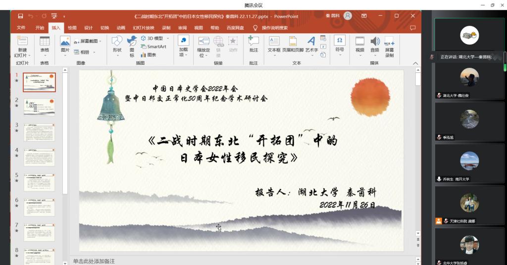 2022年11月27日,由中国日本史学会主办,北京大学历史系与天津社会科学院日本研究所承办的“中国日本史学会2022年会暨中日邦交正常化50周年纪念学术研讨会”隆重开幕,因疫情防控的需要,本次大会采用线上与线下相结合的方式开展。