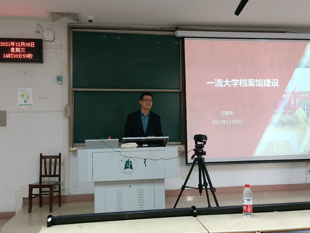 讲座期间,范智新馆长用轻松亲切的话语营造了一个愉悦的学术氛围。首先,范智新馆长从自身的学习及任职经历出发谈了对档案学专业的认识,并介绍了自己的职业选择和本科班级其他同学的就业去向,特别强调了专业可以遇冷,学业不能荒废。继而范智新馆长围绕国家要求、行业发展、历史演变等层面探讨了一流大学档案馆的建设,结合华中科技大学档案馆和其他高校档案馆的优秀实例详细讲述了高校档案工作的四个方向——基础管理工作、信息化建设、档案服务工作和档案文化编研,指出高校档案馆的工作内容由重保管转向重服务,管理对象形式由纸质档案转向电子档案,工作方向由管理转向科研。