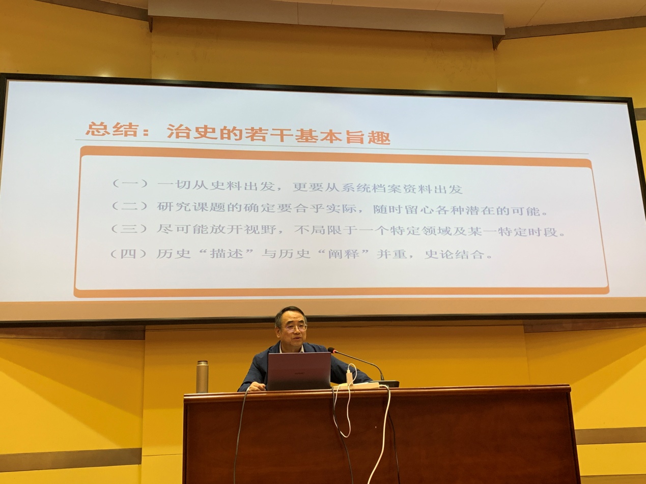 马敏教授的讲座内容分为三部分。首先,他从“治学与为人的相通性”谈起,认为治学的过程即做人的过程。他提出,第一,治学应“史无定法”,重在心领神会,不断琢磨;第二,治学须有宏观视野;第三,治学要史论结合,实事求是。