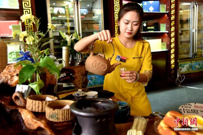 呼和浩特“万里茶道”研究体验基地工作人员向观众展示茶文化。张玮 摄