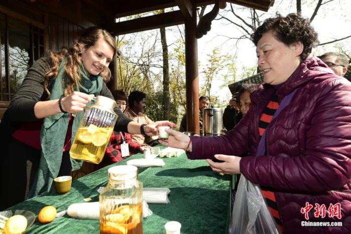 “2016杭州茶文化博览会开幕式暨西湖龙井开茶节”上,一名来自美国的茶艺爱好者请游客品尝“美国冰茶”。李忠 摄
