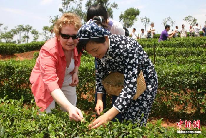 在四川省宜宾市叙府茶叶采茶基地,一位外宾向采茶姑娘学习采茶。霍潺 摄