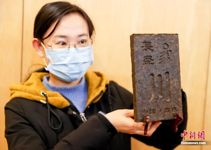 2020年12月8日,为感谢蒙古国政府和人民对湖北省人民的深情厚谊,湖北省向蒙古国捐赠一批医疗物资和生活物资。图为工作人员在武汉展示湖北向蒙古国捐赠的“川”字青砖茶。张畅 摄