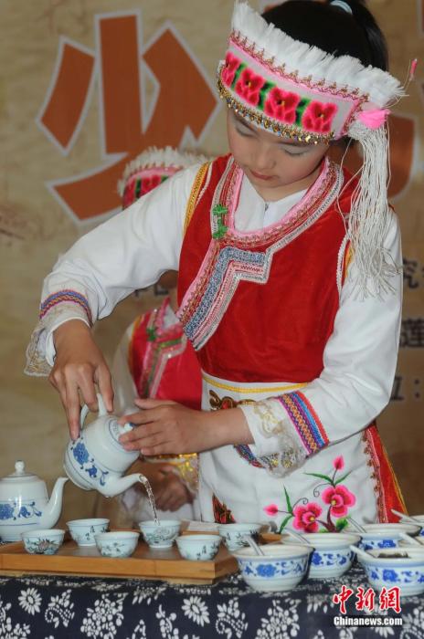 一少儿茶艺大赛现场,选手展示白族三道茶。引炜 摄