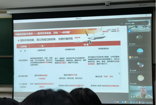 首先,曹晟教授介绍了中国铁塔的基本情况,以“深化共享、创造价值”为理念,夯实中国经济社会发展的三大数字底座——5G新基建、分布式边缘算力网络和数字塔,并介绍了人工智能、生物技术等九大新兴产业和卫星互联网、6G等未来产业,以期望建设全域视联网,丰富数字新业态。