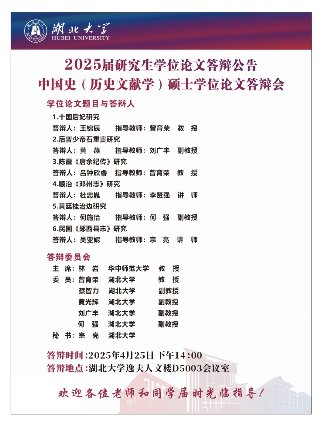 2025上半年中国史(历史文献学方向)硕士学位论文答辩会公告