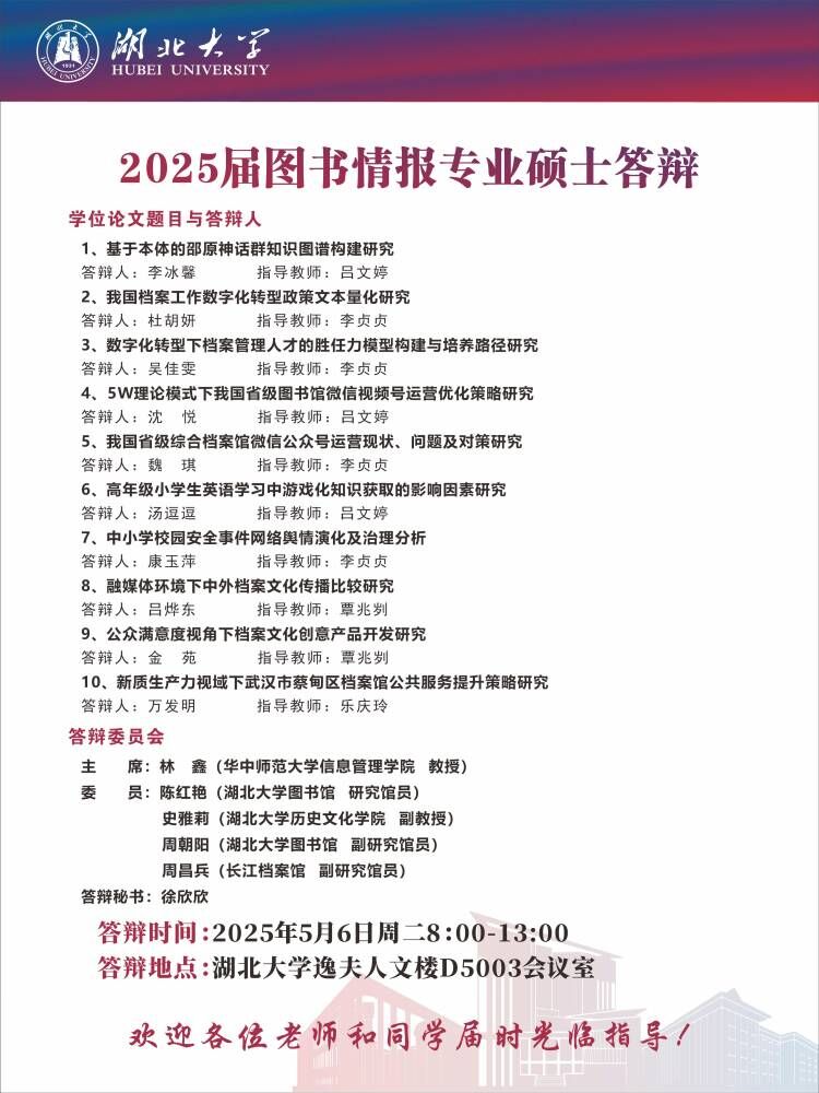 2025上半年图书情报硕士学位论文答辩会3组公告