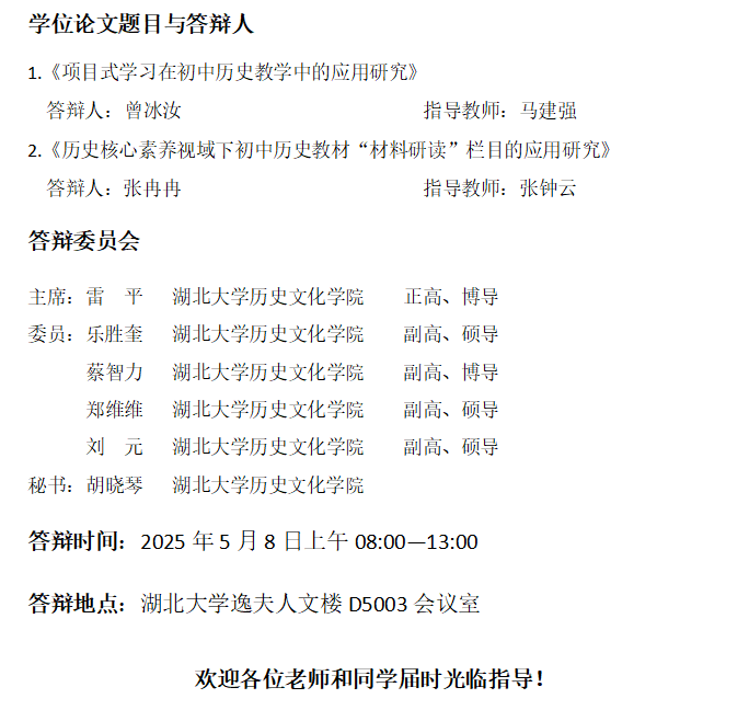2025上半年学科教学(历史)硕士学位论文答辩会5组公告