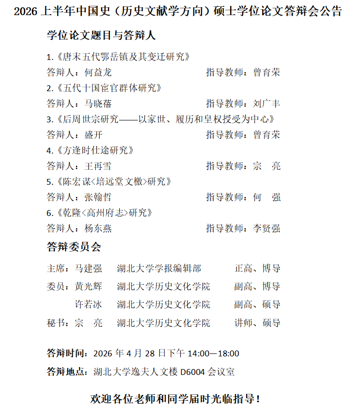 2026上半年中国史(历史文献学方向)硕士学位论文答辩会公告