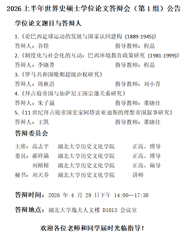2026上半年世界史硕士学位论文答辩会(第1组)公告