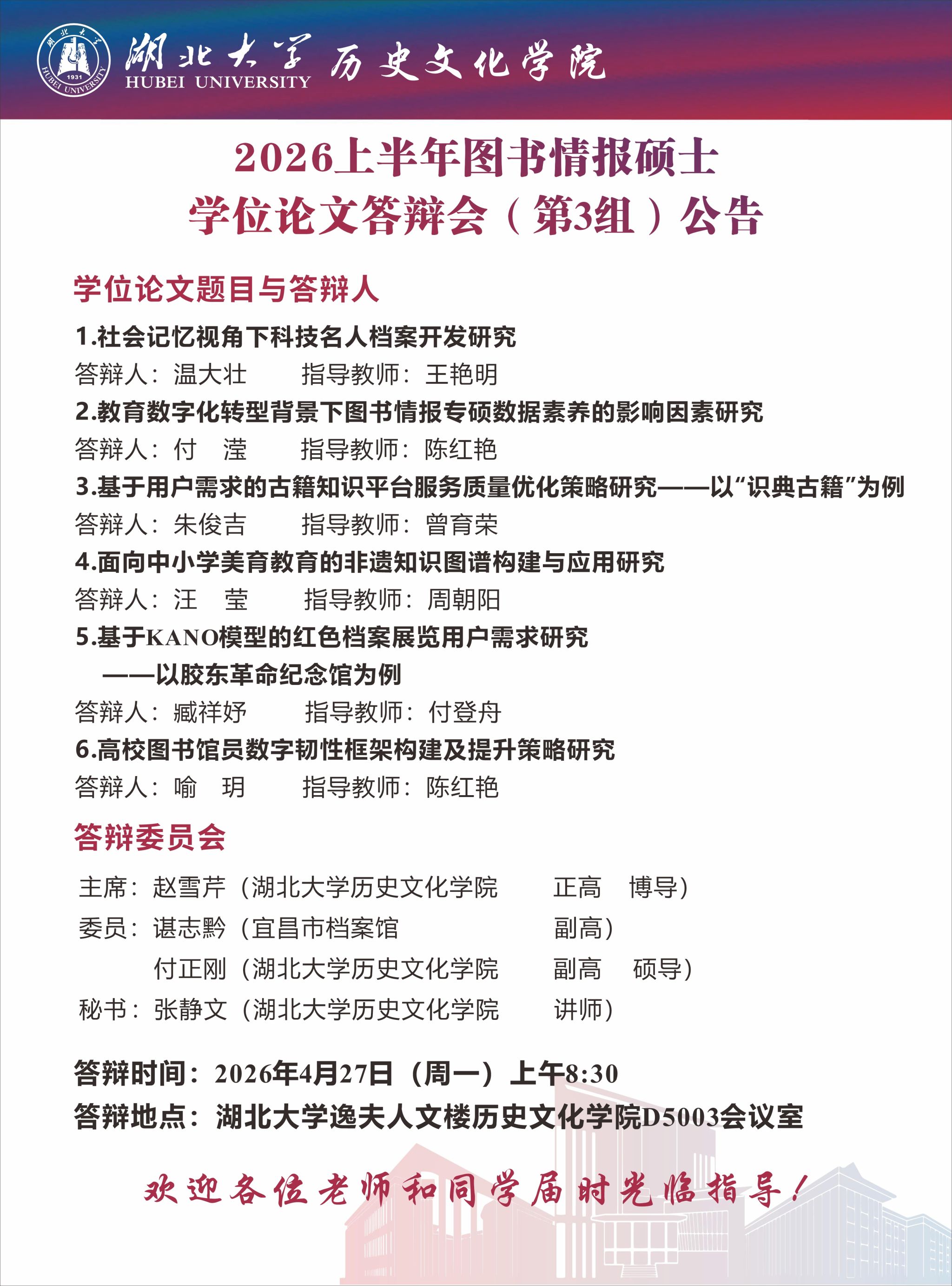 2026上半年图书情报硕士学位论文答辩会(第3组)公告