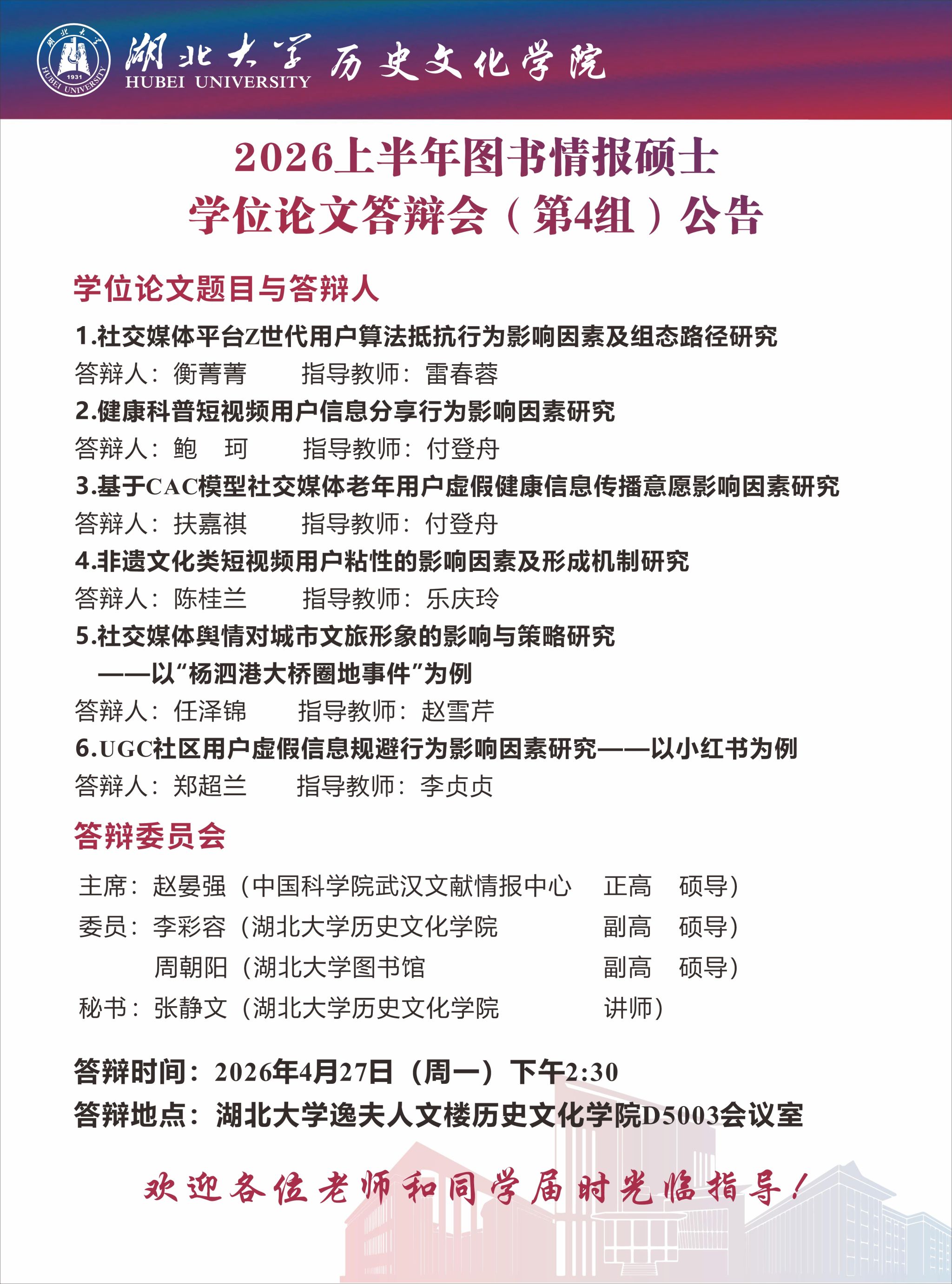 2026上半年图书情报硕士学位论文答辩会(第4组)公告