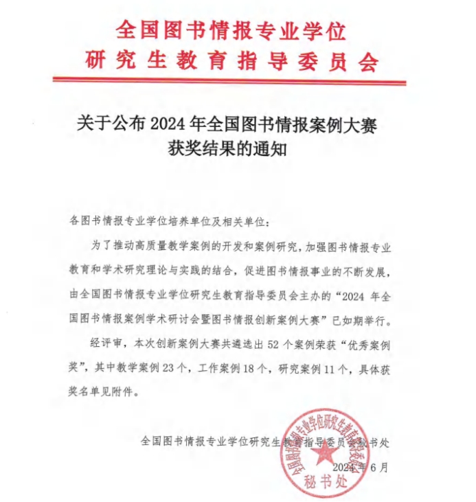 据悉,2024年全国图书情报创新案例大赛由全国图书情报专业学位研究生教育指导委员会主办,旨在推动高质量教学案例的开发和案例研究,加强图书情报专业教育和学术研究理论与实践的结合,促进图书情报事业的不断发展。案例大赛的稿件征集范围为图书情报领域的教学案例、研究案例和工作案例。本次创新案例大赛共遴选出52个案例荣获“优秀案例奖”,其中教学案例23个,工作案例18个,研究案例11个。