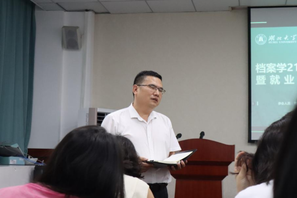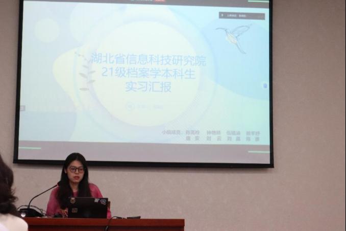 本次实习单位包括湖北省科技信息研究院、青山区档案馆、铁四院、中铁大桥局、湖北日报等9家单位。各组实习生代表依次上台分享实习期间的收获及感悟。他们或见识到了更细化的档案工作,或参与了相关行政管理工作,或体验了团队温暖的氛围。实习生们纷纷表示,通过实习更加深入了解到档案工作的内容与要求,提高了专业素养与实践能力,受益匪浅。