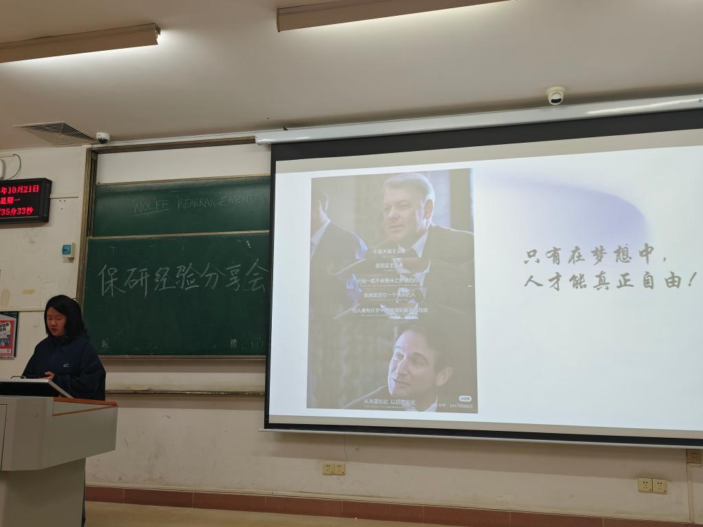 姚立颖同学成功保研至上海大学。她满怀热情地与学弟学妹们分享了自己的宝贵经验。她告诉大家了解自己是迈向成功的重要一步,每个人都需要清晰地认清自己的长远目标和当前能力,这样才能制定出切实可行的计划并稳步前进。她还慷慨地分享了自己在参与科研竞赛和选择科研方向过程中的个人感悟。她提到,在科研的道路上,坚持不懈和勇于探索是至关重要的品质。面对挑战和困难时,保持积极的心态和持续的学习能力,能够帮助我们不断突破自我,取得更加显著的成果。最后,她以一句充满力量的话语鼓励大家:“只有在梦想中,人才能真正自由。”