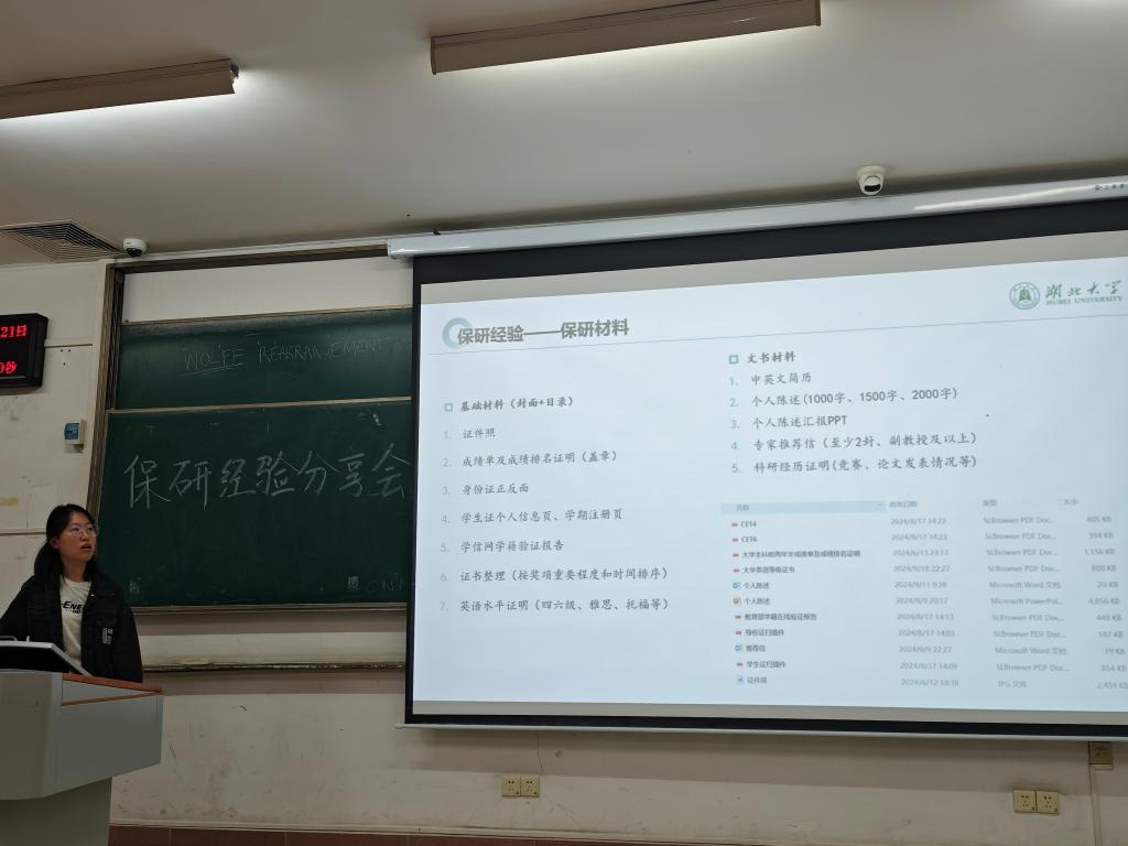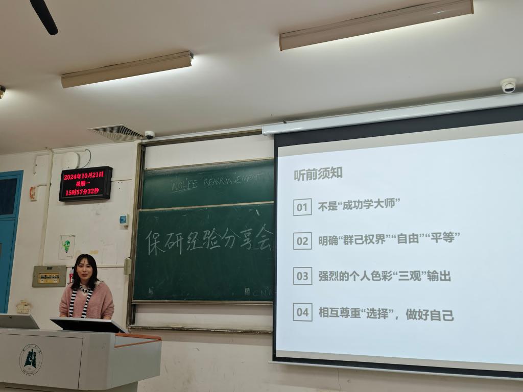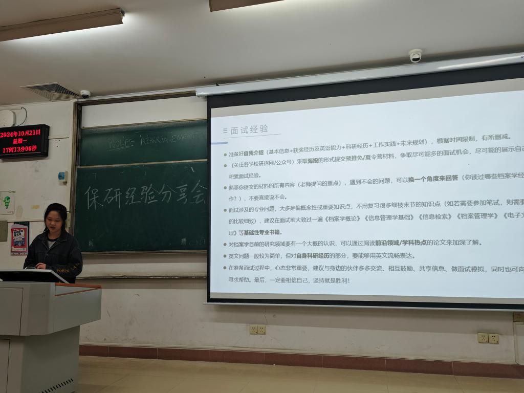2024年10月21日下午,一场别开生面的档案系保研经验分享会在教4-409教室成功举办。此次分享会由档案学23级班主任徐欣欣老师主持,21级7位保研成功的学姐为22级和23级的学弟学妹们传授宝贵的保研经验。