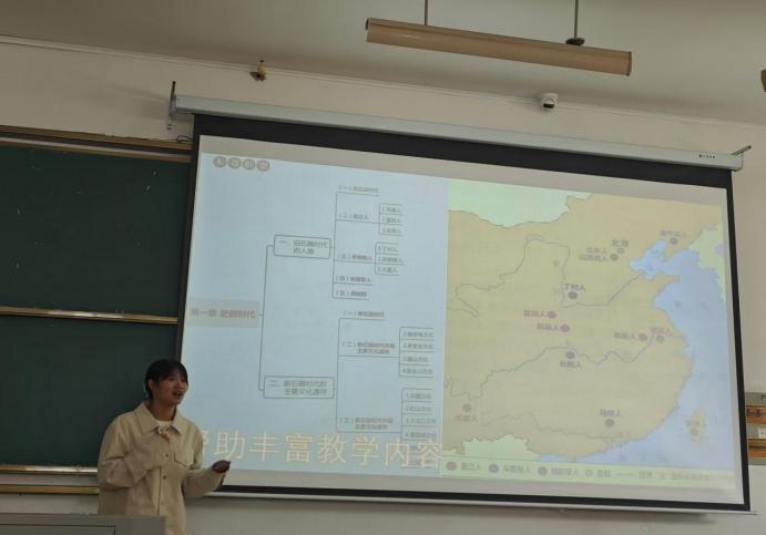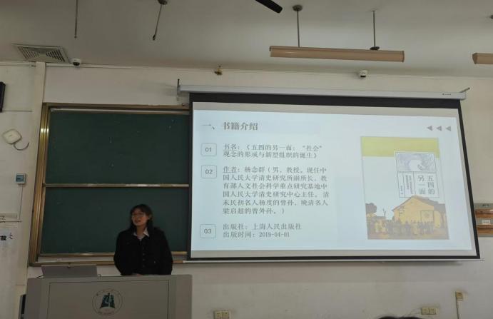 在分享环节,8位同学围绕书籍介绍、核心内容、教学思考等三部分分别分享了陈勤著《简明日本史》、杨念群的《五四的另一面:社会观念的形成与新型组织的诞生》、苏霍姆林斯基《给教师的建议》等书籍,重点展示了自己通过阅读该书籍对今后的中学历史教学实践带来了启示与思考。例如23级崔珂同学分享了她阅读《五四的另一面》这本书,能够以一种长时段、大历史观的视角去理解五四运动,把历史事件放在比较长的历史时段中去认识,以解释历史发展的趋势。基于此,她结合五四运动的历史发展进程,做了主题为“近代中国社会的沉沦与上升”的单元教学设想。
