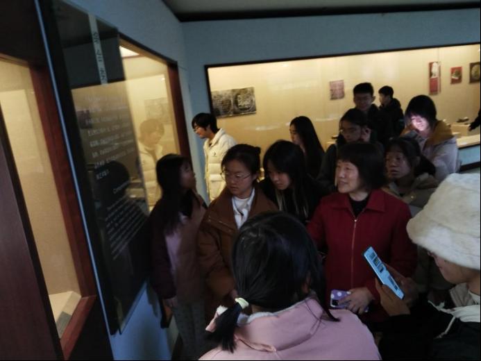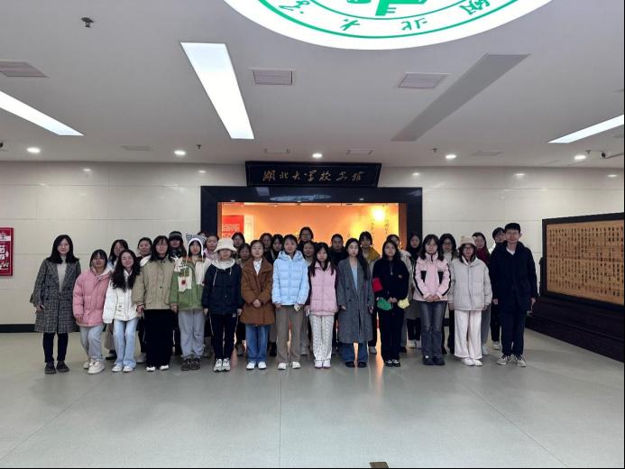 在老师带领下,同学们首先来到图书馆二楼校史馆,这里记录着学校从创立至今的辉煌历程与不懈奋斗。步入校史馆,首先映入眼帘的是庄重肃穆的李先念主席雕像。在讲解员的细致讲解下,同学们深入了解了学校的发展脉络、重要事件及杰出校友,深刻体会到了“日思日睿,笃志笃行”的校训精神。