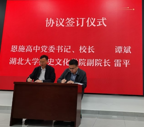 22日上午,我院与恩施高中战略合作协议签署仪式在恩施高中隆重举行,我院副院长雷平和恩施高中党委书记、校长谭斌在战略合作协议书上签字。我院副院长刘彦波为恩施高中历史教科室主任刘涛老师颁发英国365集团公司硕士研究生校外导师聘书。这标志着我院与湖北省级重点高中的教研合作迈向一个新的台阶。