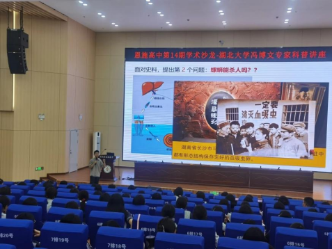 作为此次战略合作的重要内容之一,21日晚,我院冯博文博士为恩施高中学子送去了一场别开生面的讲座。讲座以《螺蛳杀人?历史推理与历史解释的魅力》为题,引用中国古代江西一则奇特的螺蛳杀人传说作为切入点,通过巧妙设计、层层递进的设问,引领学生展开环环相扣的推理,一步步揭开事件迷雾,深度剖析事件背后潜藏的深意。整场讲座故事新奇,问题巧妙,推理周密,展示历史研究魅力的同时,帮助高中学生初步构建起历史研究思维,赢得了恩高师生的高度赞誉。