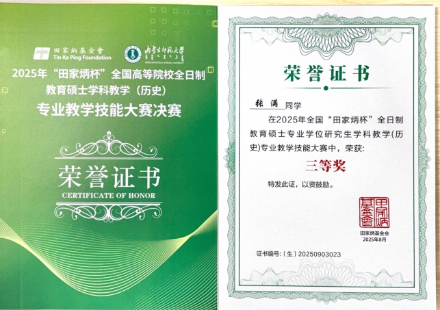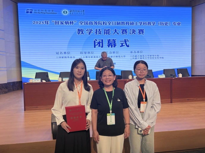 2025年8月22日至25日,全国“田家炳杯”全日制专业学位研究生学科教学(历史)教学技能大赛决赛在内蒙古师范大学顺利举办。该赛事旨在全面展示教育硕士的教学专业能力,呈现各培养院校的人才培养成果。经过多轮激烈角逐,我院学科教学(历史)专业张满同学荣获比赛三等奖,邓慧玲同学荣获优秀教学设计奖。