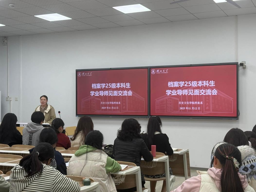 为加强师生相互了解,帮助学生明确学业规划,开启大学生活的崭新篇章,2025年11月12日下午,档案学系在长江新区校区问津楼B211教室举办了2025级本科新生与学业导师见面暨优秀学子经验分享会。本次会议由档案学2501班班主任李青维老师主持,档案学系雷春蓉、李彩容、吕文婷、徐欣欣、李梓奇、张静文等老师,档案专业2022级和2023级优秀学生代表,档案学2025级全体同学参加。