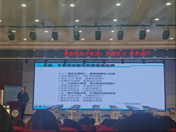 本次活动还特邀武汉市教育科学研究院高中历史教研员张尊健老师作专题分享。张老师以“深研核心素养 破解高考试题——品题、命题、破题、用题高考(模拟)试题四部曲”为主题,深入剖析初高中教学衔接的关键点,为未来教学创新与素养提升提供了切实可行的指导。