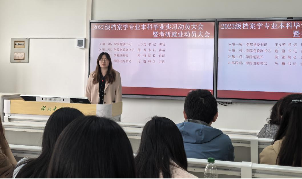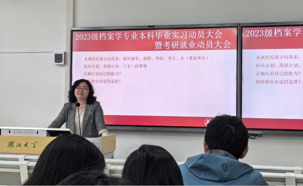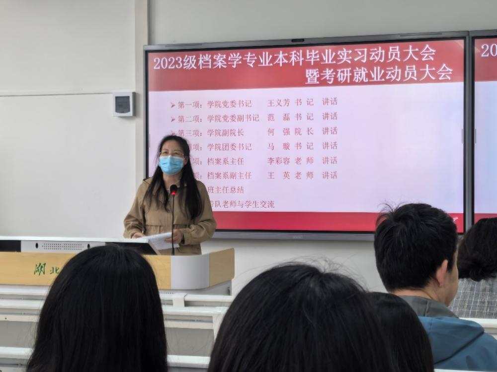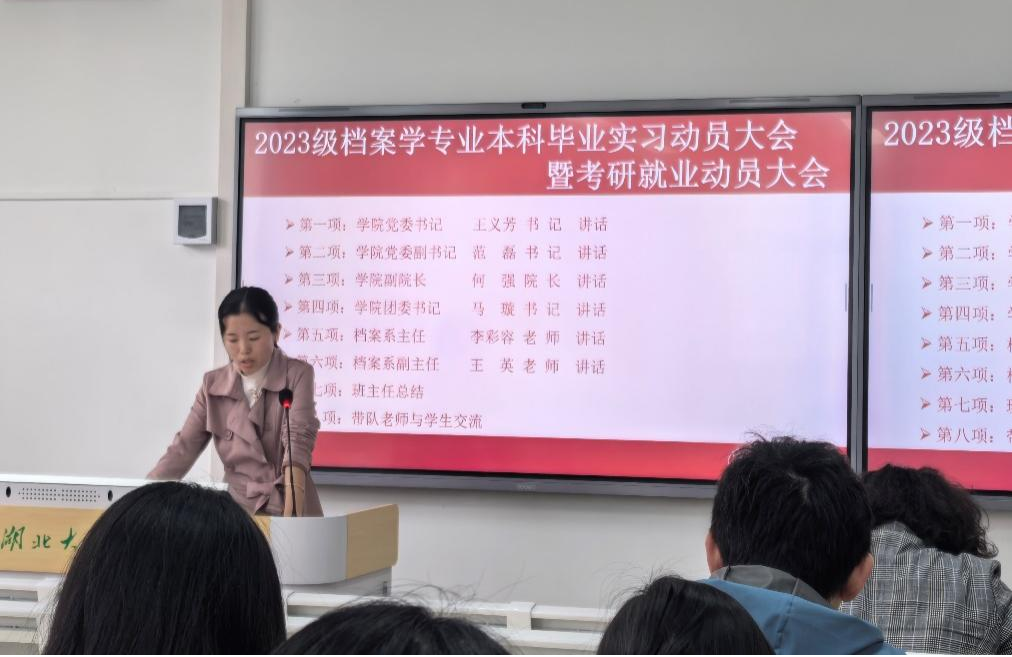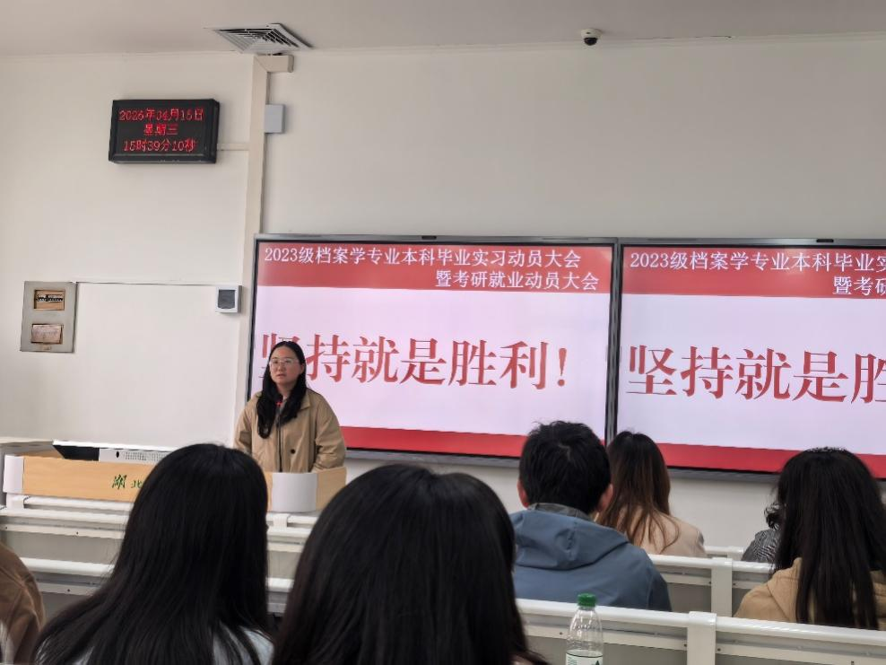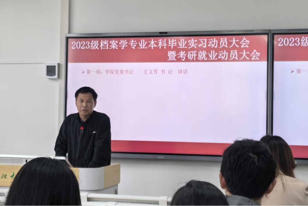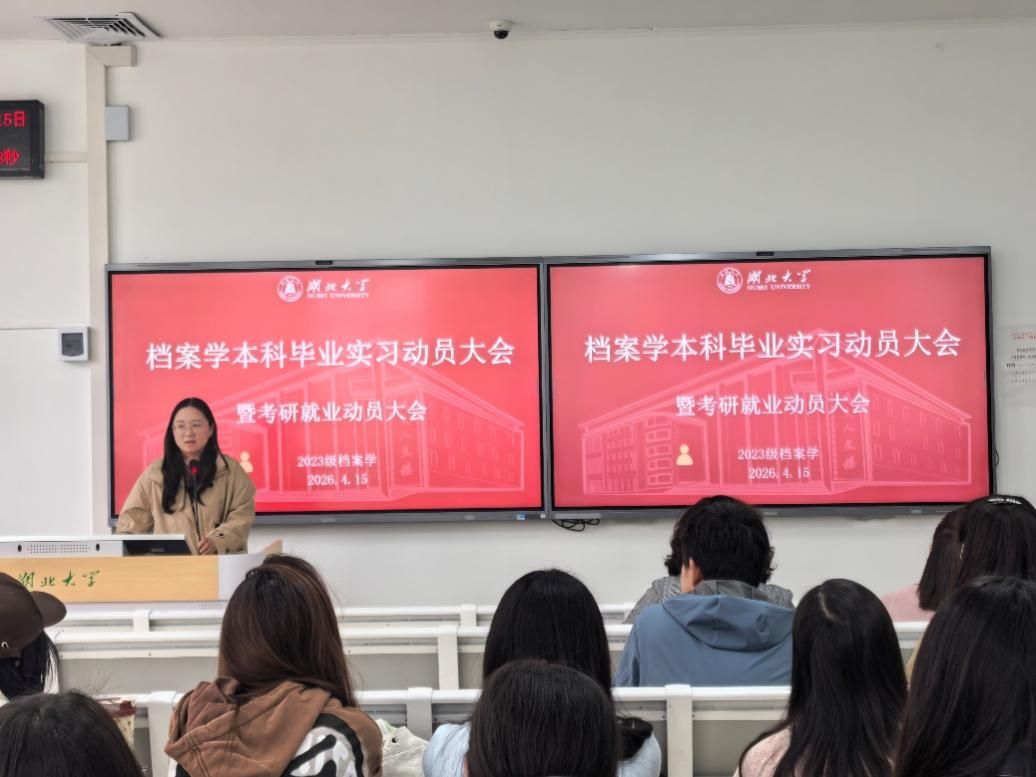 2026年4月15日下午,2023级档案学本科毕业实习动员大会暨考研就业动员大会于教四203教室召开。会议由张静文老师主持,特邀英国上市365党委书记王义芳、团委书记马璇参加。档案系主任李彩容、系副主任王英、档案学系实习指导老师赵雪芹、李晓溪、史雅莉、李贞贞,以及档案学2301班全体同学参会。