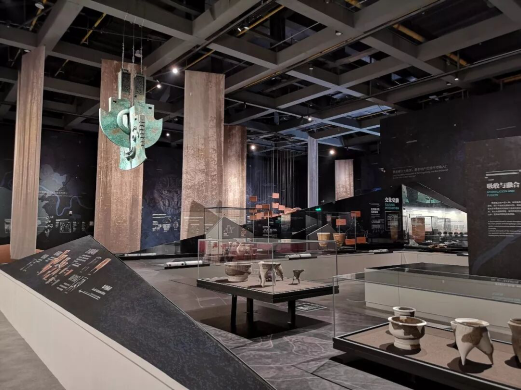 9:00整,考察队全体成员抵达盘龙城国家考古遗址公园大门,通过安检后来到盘龙城遗址博物馆展厅。博物馆共设有三个主题展厅,大家跟随着讲解员的脚步,首先参观了第一展厅“浪淘千古”,了解了盘龙城的考古发现历程,认识了为盘龙城遗址面世做出重要贡献的蓝蔚、王劲、李伯谦等考古名宿;接着我们来到第二展厅“故邑风物”:欣赏了商代早期罕见的青铜大圆鼎、象征权力的青铜钺和大玉戈以及中原商文化系统中发现年代最早的金玉镶嵌饰物“绿松石镶金片饰件”等多件精美文物,亲手触摸了3D打印的兵器、陶罐及考古发掘出的陶片实物,多角度全方位感受盘龙城先民的生产生活,了解盘龙城三百余年兴亡衰落的历史;最后来到第三展厅“角立南土”:迈步进入展馆,多样、起伏、立体的展馆布局令人眼前一亮,展览内容也进一步拓展了大家的思维时空,展览文物的历史时序由早商延伸至夏代、石家河文化时代,文物出土的空间范围由长江中游的盘龙城扩展至长江上游、黄河中游,通过与不同时代、不同地区器物形制特色、制作技术的对比,盘龙城文化的历史渊源和地位更清晰地展示在我们面前。