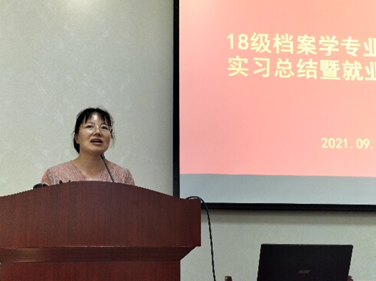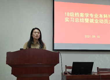 最后,档案系主任李彩容老师总结了郭书记、王老师和郭老师的就业建议和殷切期望,并对同学们圆满完成毕业实习表示祝贺,希望同学们在今后的学习工作中收获更多,前程似锦!