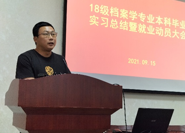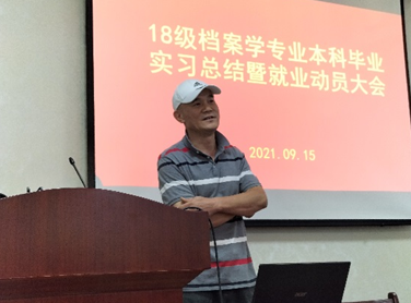 9月15日下午,2018级档案学专业本科毕业实习总结暨就业动员大会在学院D1013会议室举行,学院党委副书记郭仿兰、学工办主任郭勇、档案系主任李彩容、档案系部分教师以及18级档案学专业全体同学参加会议。会议由班主任李贞贞老师主持。