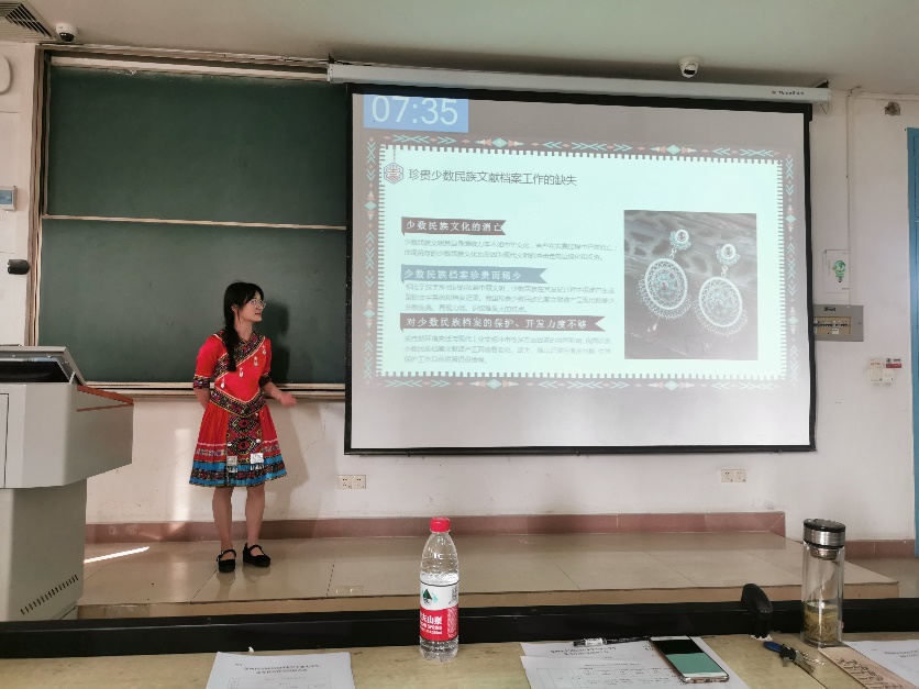 针对当下少数民族档案缺失和民族文化逐渐消亡的现状,2020级覃昌椰小组的作品《走进“毕兹卡”的世界——土家族文化的档案化传承研究》在广泛收集土家族档案后,借助微信公众号,通过推文、答题、视频等方式宣传土家族文化,答辩人的一身土家族特色服饰也深深吸引了现场师生的目光。
