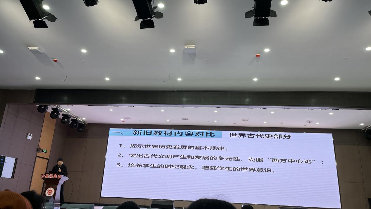 杜文老师做了题为《统编版<中外历史纲要(下)>与人教版必修教材的对比及选必融合的思考》的报告。分析世界史部分的新变化,并总结了统编版世界史部分的特点,即具有世界性,从中国角度认识世界历史,体现学生核心素养。