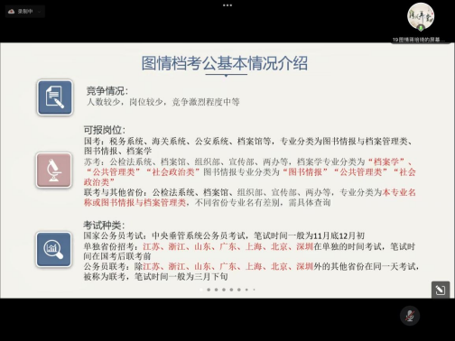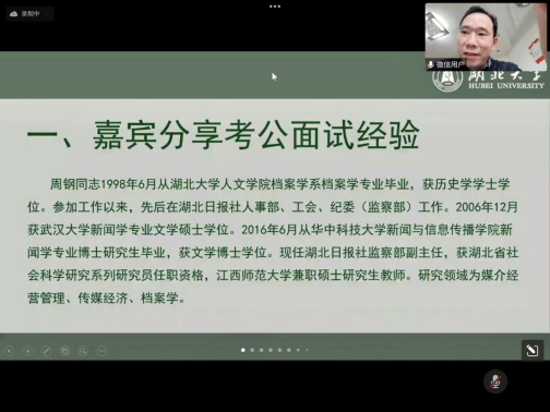 学生分享阶段,5位同学从考公考编应试者的角度分别分享了自己的经验。蒋培琦同学就职于镇江市委党校,他主要针对国考、联考和江苏省省考,从图情档考公情况介绍、公务员考试备考经验、报名经验、研究生期间时间规划四个方面做了全面而详细的介绍,具体包括图情档专业包括的竞争情况、可报岗位、考试种类、如何准备、报名注意事项等,并提醒学弟学妹们要注意协调并平衡好专业实习、论文写作、备考、找工作等的时间安排。蔡铨同学就职于咸宁市委办公室,她从亲身经历出发,对湖北省“人才引进”形式考取公务员的时间节点、报名、面试、人才补贴等进行了介绍,并强调研究生期间的科研训练和文字功底对未来工作的重要性,正是得益于读研期间发表的科研成果,她顺利通过了人才引进的面试。王铖同学就职于宜昌市税务局,他分享了公务员报考的经验和工作后的感悟,提醒同学们谨慎报名异地乡镇,抛开对公务员身份的滤镜,切忌为了上岸而报名。值得一提的是,这两位男同学同时也是室友,他们另外一位室友也考取了武汉市公安局的公务员岗位。张睿婵同学就职于长江三峡通航管理局,她分享了如何规划备考时间,且应关注人才引进、选调生、单招和三支一扶等相关考试信息。尹航同学目前就职于孝感市孝南区卧龙乡人民政府,她本科毕业通过“三支一扶”方式进入蔡甸区团委工作,两年后又考取孝感市集中选调公务员岗位,她介绍了自己的备考经验和基层公务员的工作情况。
