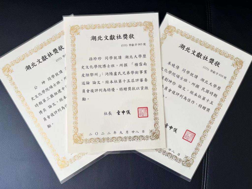 2022年10月,台湾《湖北文献》社第十五届研究生论文征文活动评选揭晓,我院雷平教授、马建强副编审、郑维维副教授指导的3名学子斩获佳绩。2020级博士研究生孙珍珍《“积雪南皮陋鄂州”:沔阳卢氏兄弟学术事业述论》一文荣获“特优奖”;2020级硕士研究生公坤、朱晓倩分别以《武汉抗战时期第三厅组建中国共两党的政治博弈》以及《民国时期汉口汉剧坤伶》获“佳作奖”。