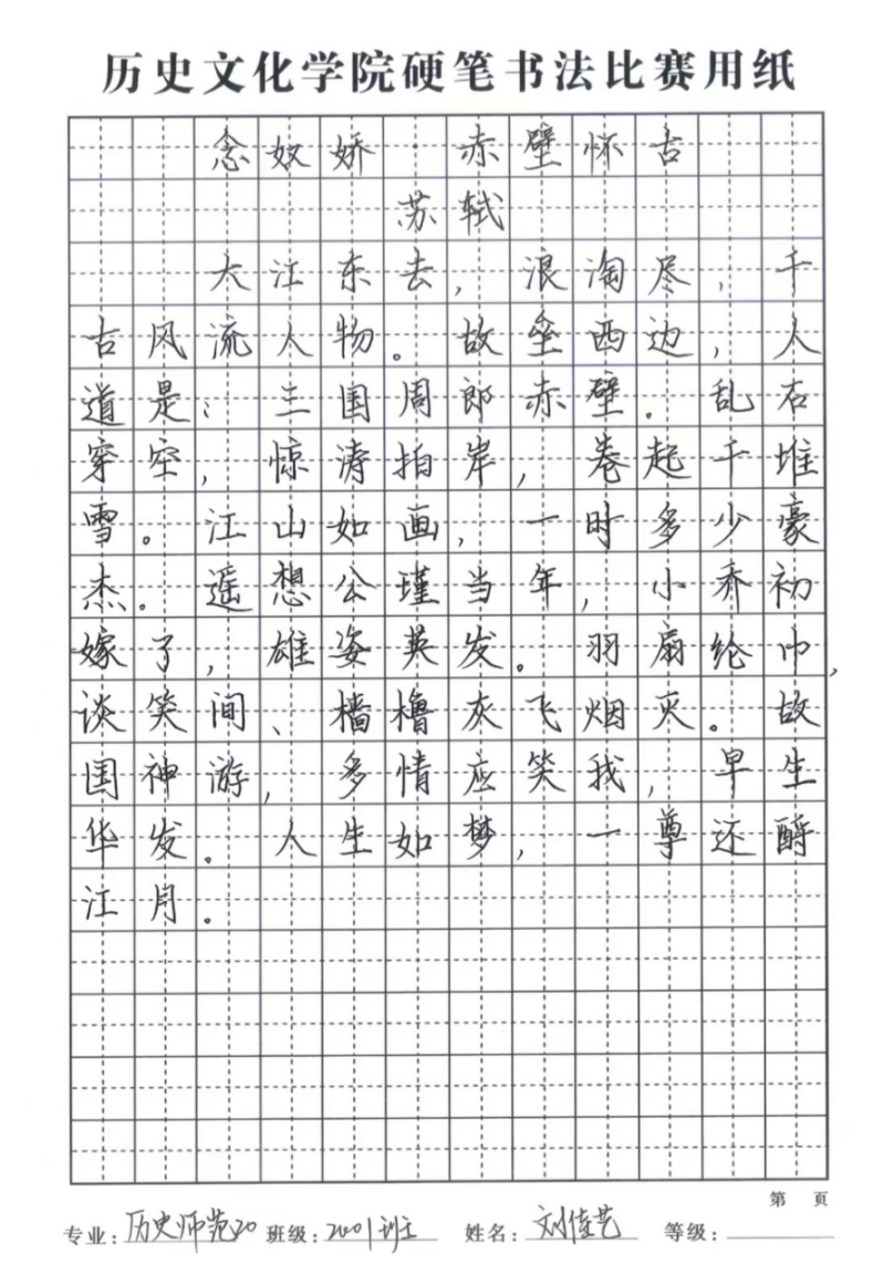 硬笔特等奖:刘佳艺(20级历史)
