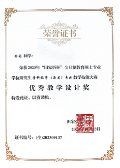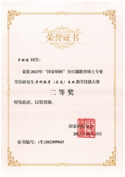 2023年10月20日至23日,在全国教育专业学位研究生教育指导委员会举办的“田家炳杯”全日制教育硕士专业学位研究生教学技能大赛中,我院2022级教育硕士学科教学(历史)专业罗妍婷同学获得二等奖,俞莉同学获得优秀教学设计奖,刘馗老师获得优秀指导教师奖。
