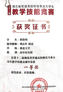 2023年11月11日,在华中师范大学举办了第十二届湖北省普通高校师范专业大学生技能竞赛决赛阶段比赛。我院2021级历史学(师范类)专业本科生蔡依明经过一上午的努力比拼,最终斩获高中历史组一等奖(第一名)。