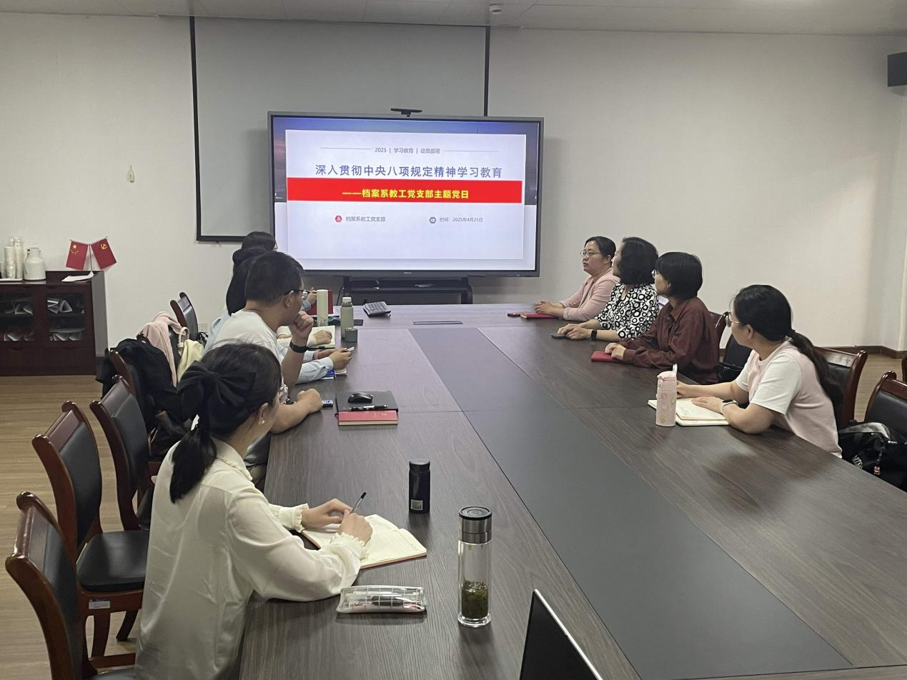 2025年4月25日上午,档案系教工党支部开展了主题为“深入贯彻中央八项规定精神学习教育”的主题党日活动,活动由党支部书记赵雪芹主持。