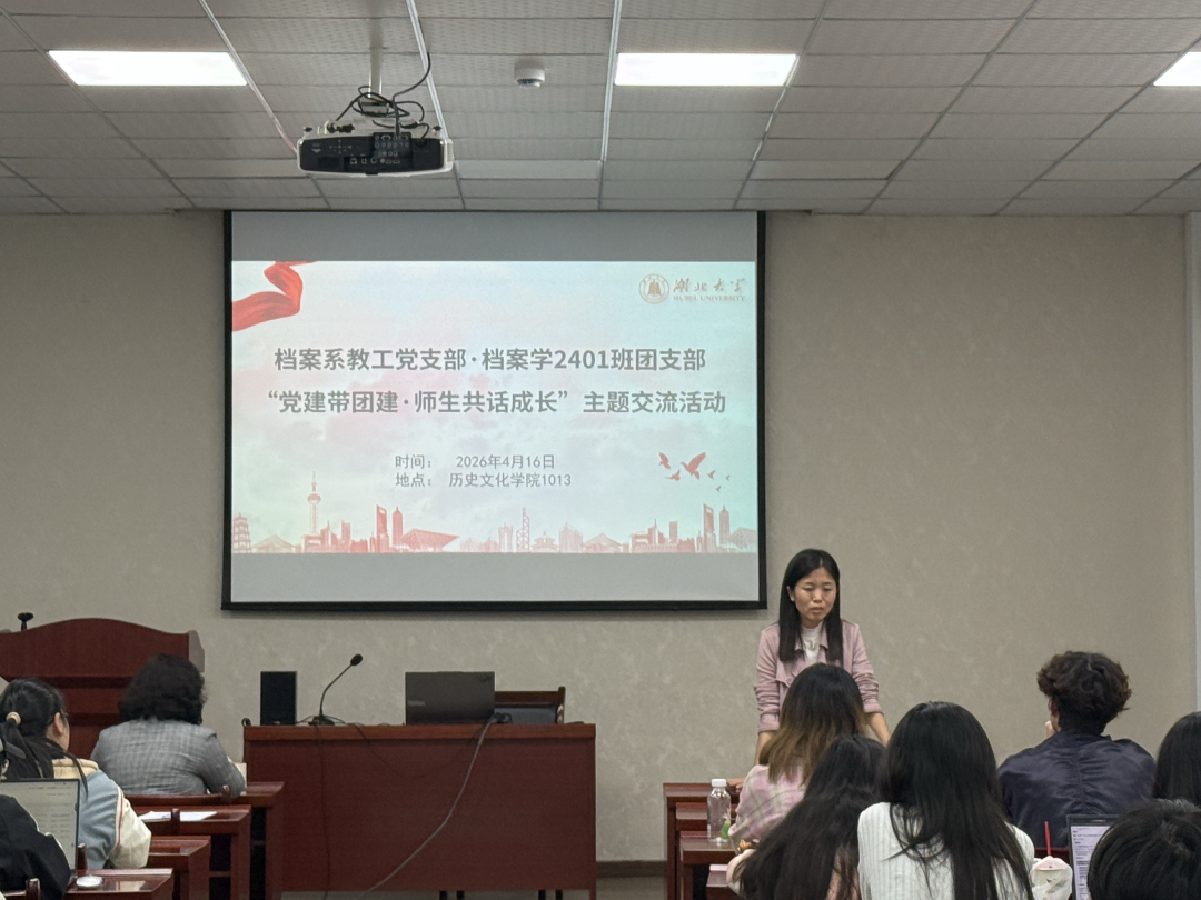 2026年4月16日,档案系教工党支部与档案学2401班团支部联合举办主题交流活动,党支部书记赵雪芹老师、系副主任王英老师、张静文老师(档案学2401班主任)作为教师党员代表,围绕专业能力提升、职业生涯规划相关话题,与同学们进行交流对话。档案系教工党支部书记赵雪芹老师围绕学生对于未来发展规划的困惑,提出夯实专业基础、积累实习经验、灵活利用学术资源与学习平台的宝贵建议。